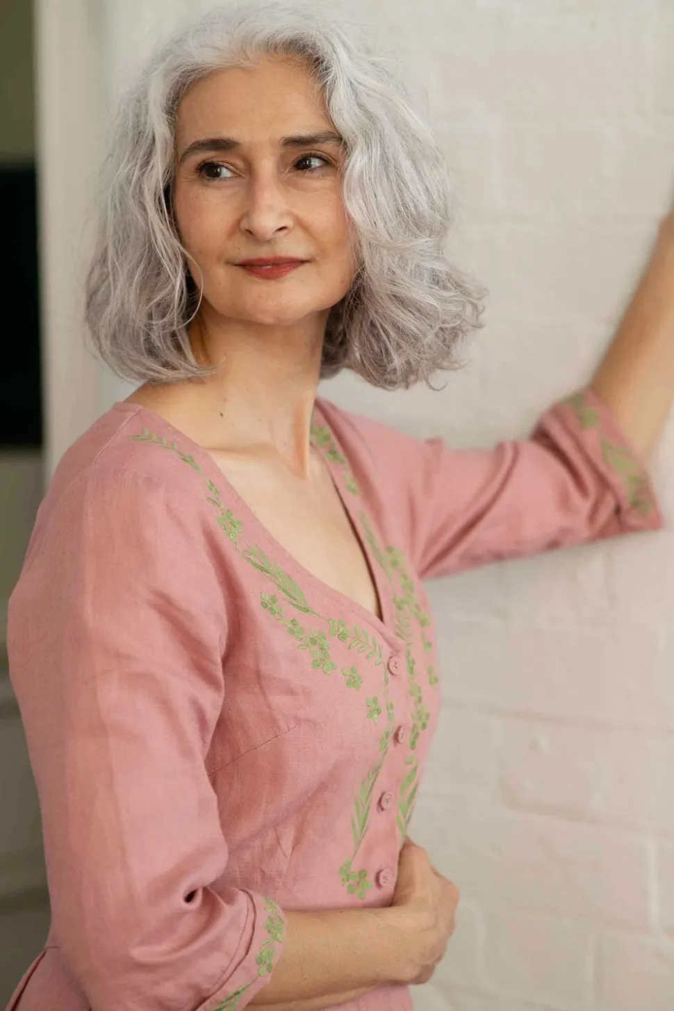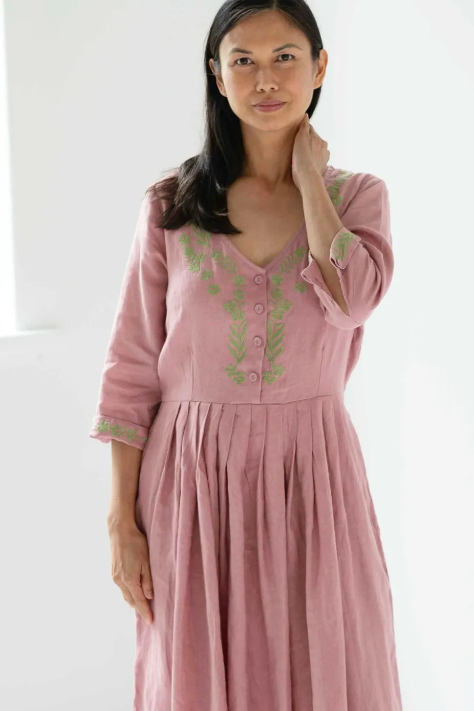 It Is Rose Pink And Has Beautiful Matte Embroidery In A Contrast Green On The Bodice And Sleeve Cuffs.