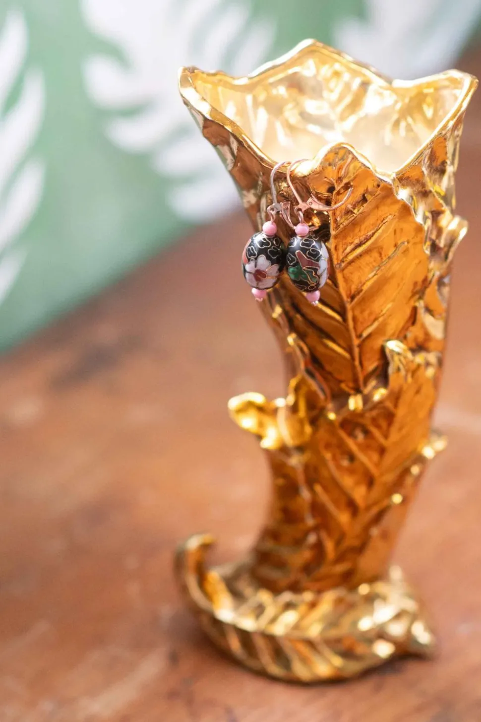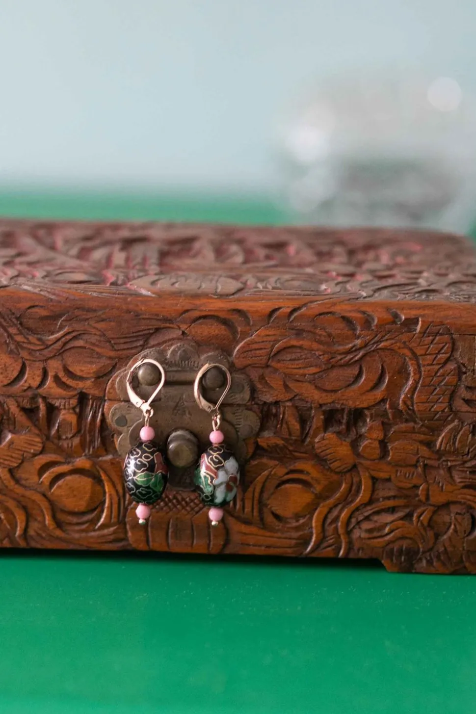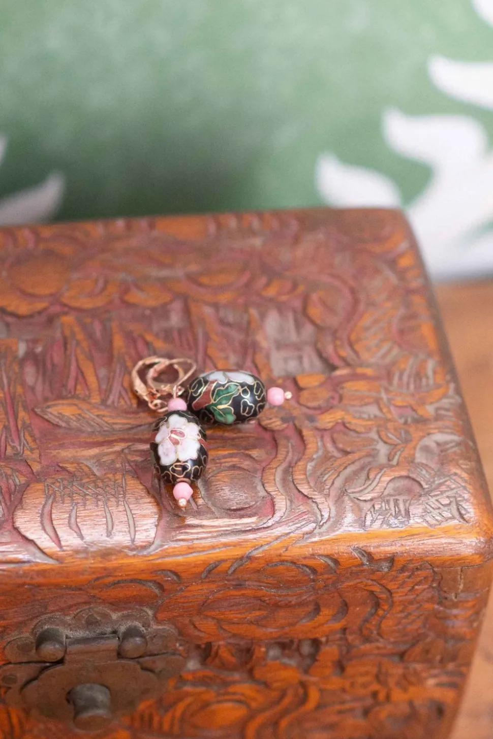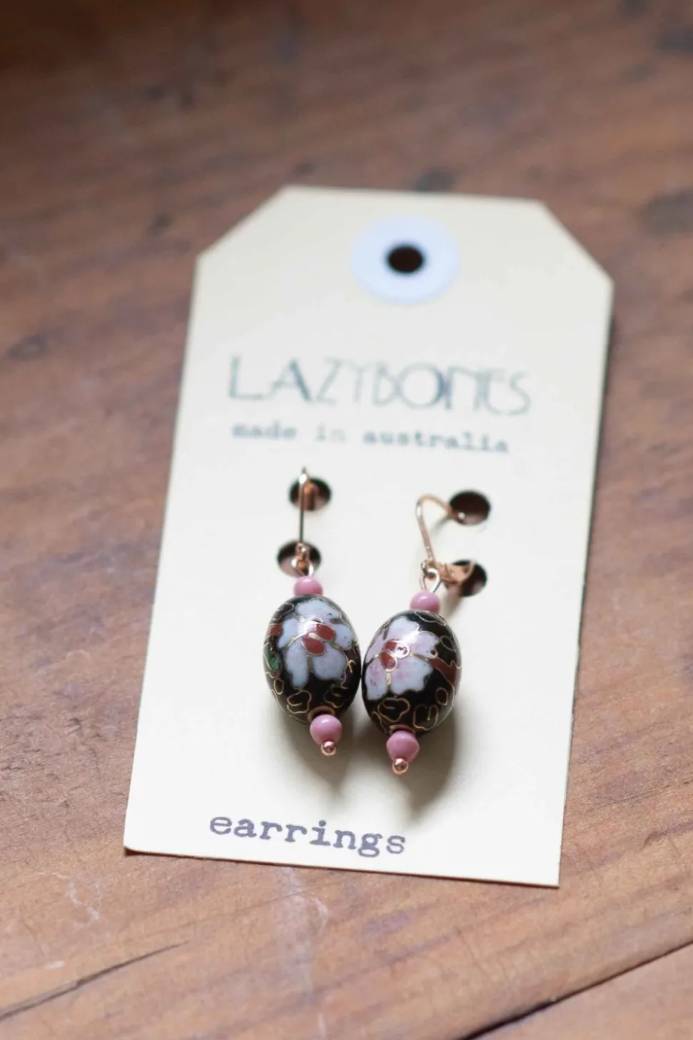 Vintage Cloisonne Enamelled Brass Beads Hung With Two Small Pink Japanese Glass Beads From Rose Gold Tone Plated Stainless Steel Lever Back Earring Hooks.