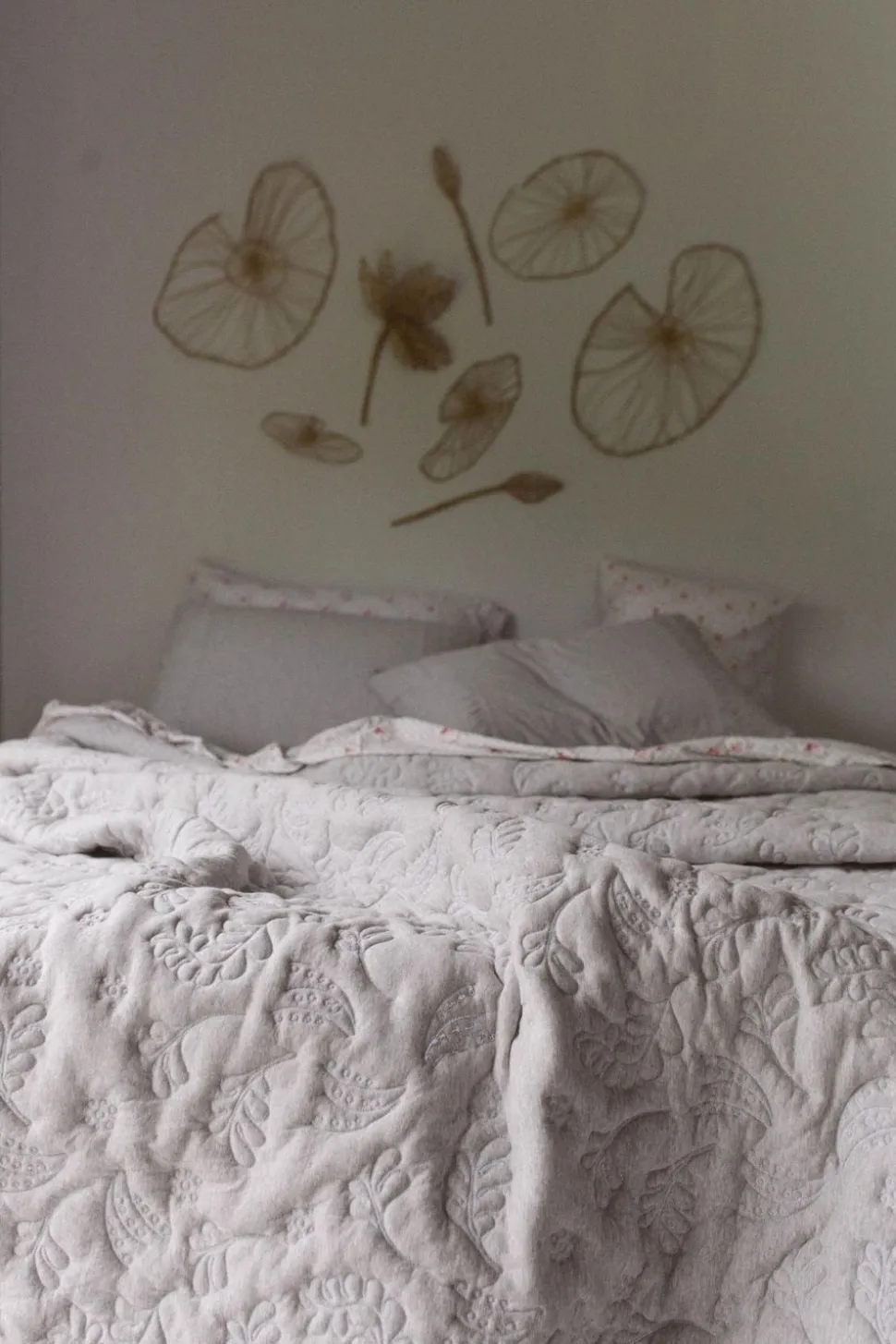 This Quilt Has A Lovely Mid Green Marle On One Side And A Lighter Grey Marle On The Other Side And Is Joined Together With A Bloomsbury Inspired Stitched Floral Design.