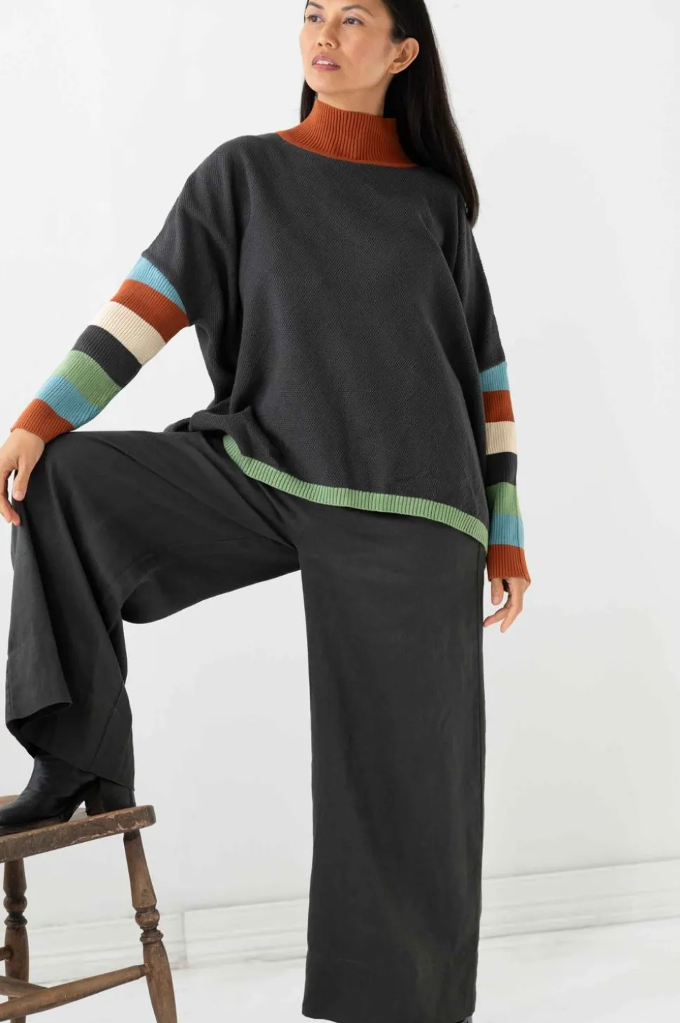 The Sleeves Have Stripes In 5 Colours, Rich Rust, Pale Green, Charcoal, A Light Sky Blue And A Warm Cream.