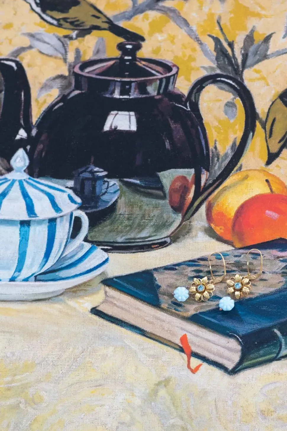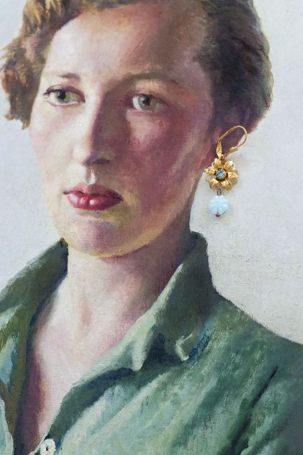 Our New Earrings Feature A Vintage Blue Swarovski Crystal Centre Set In A Multilayer Delicate Brass Flower With Attached Small Aqua Blue Glass Flower