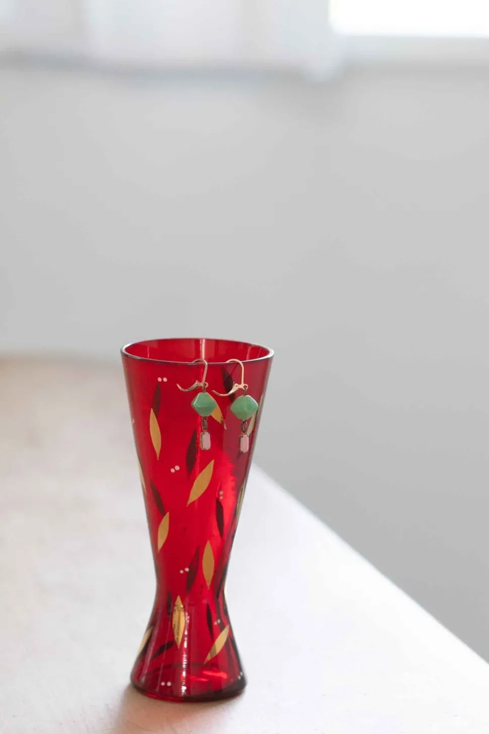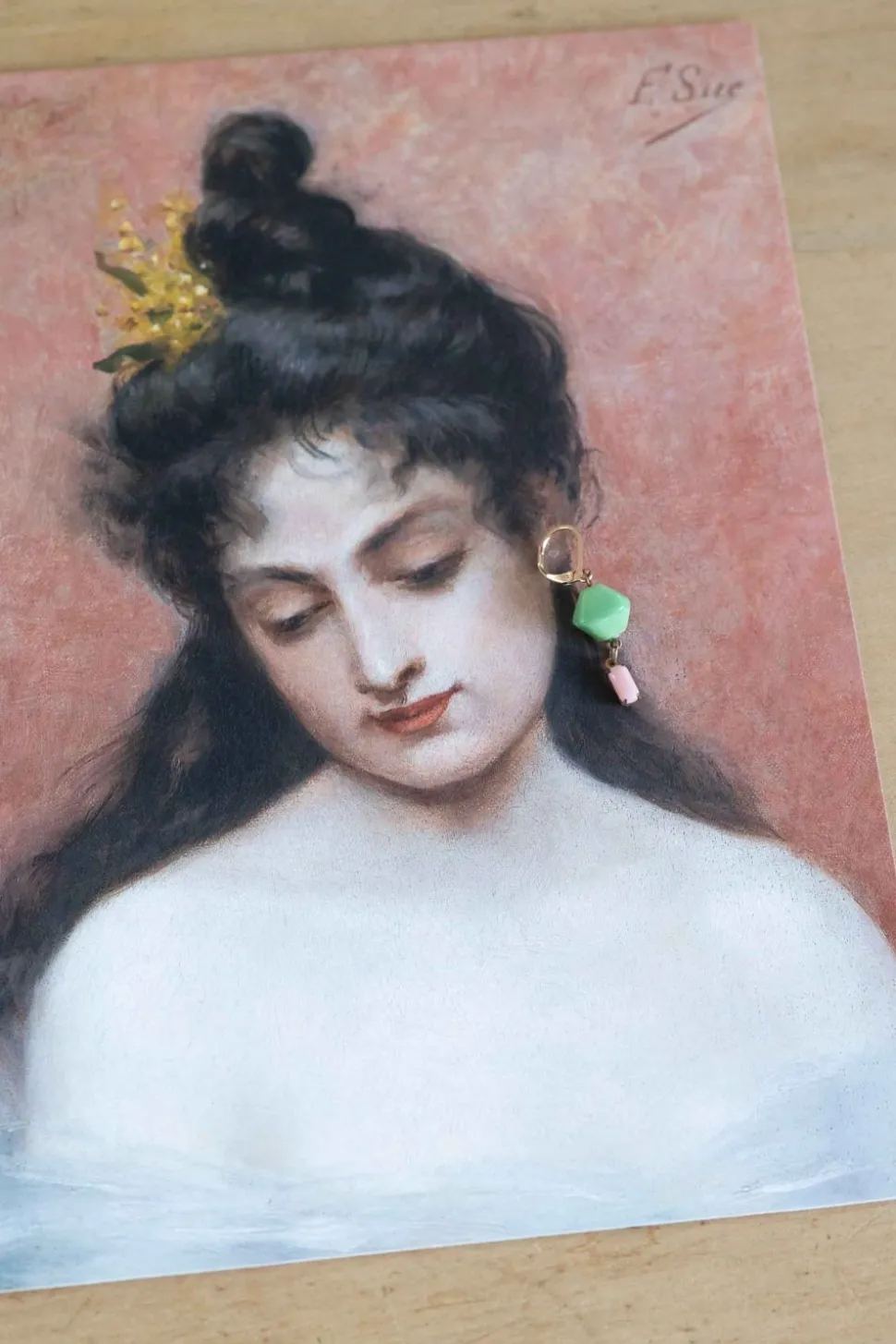 Vintage Celadon Faceted Celadon Green Glass Bead With Small Japanese Rectangular Pink Glass In Brass Settings Hung From Rose Gold Toned Lever Backs. 2.5Cm Drop