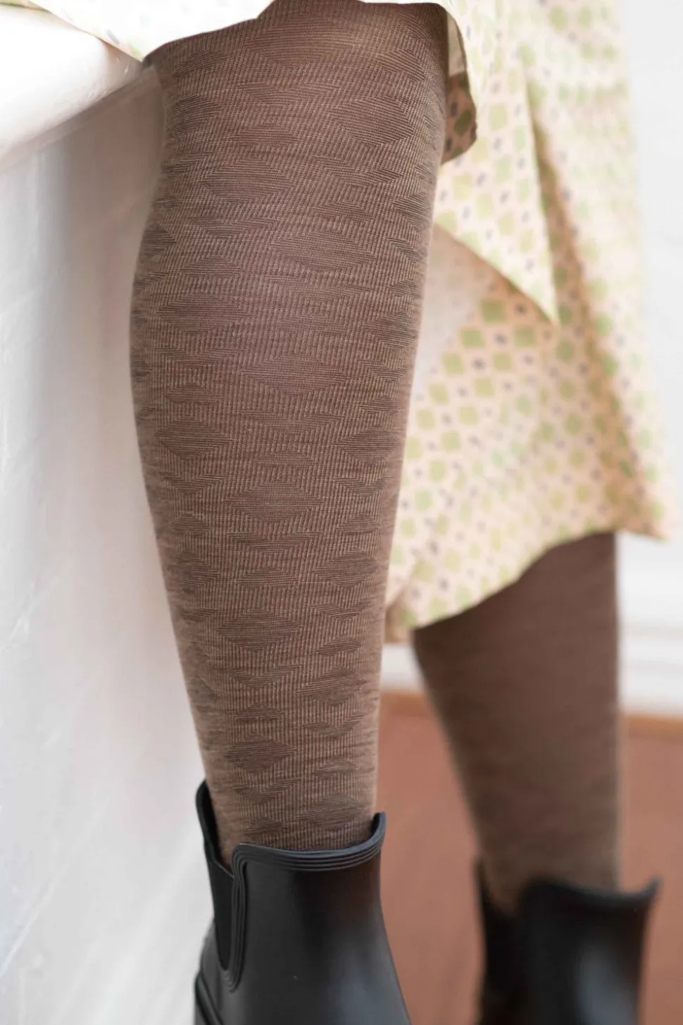Luxurious, Warm And Comfortable Merino Wool Tights With A Geometric Pattern On A Milk Chocolate Brown Background.