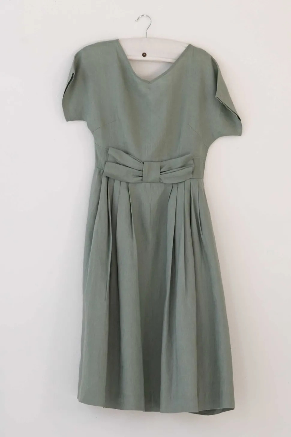 Wide V Neckline, Fitted Bodice And Bat Wing Narrow, Short Sleeves.