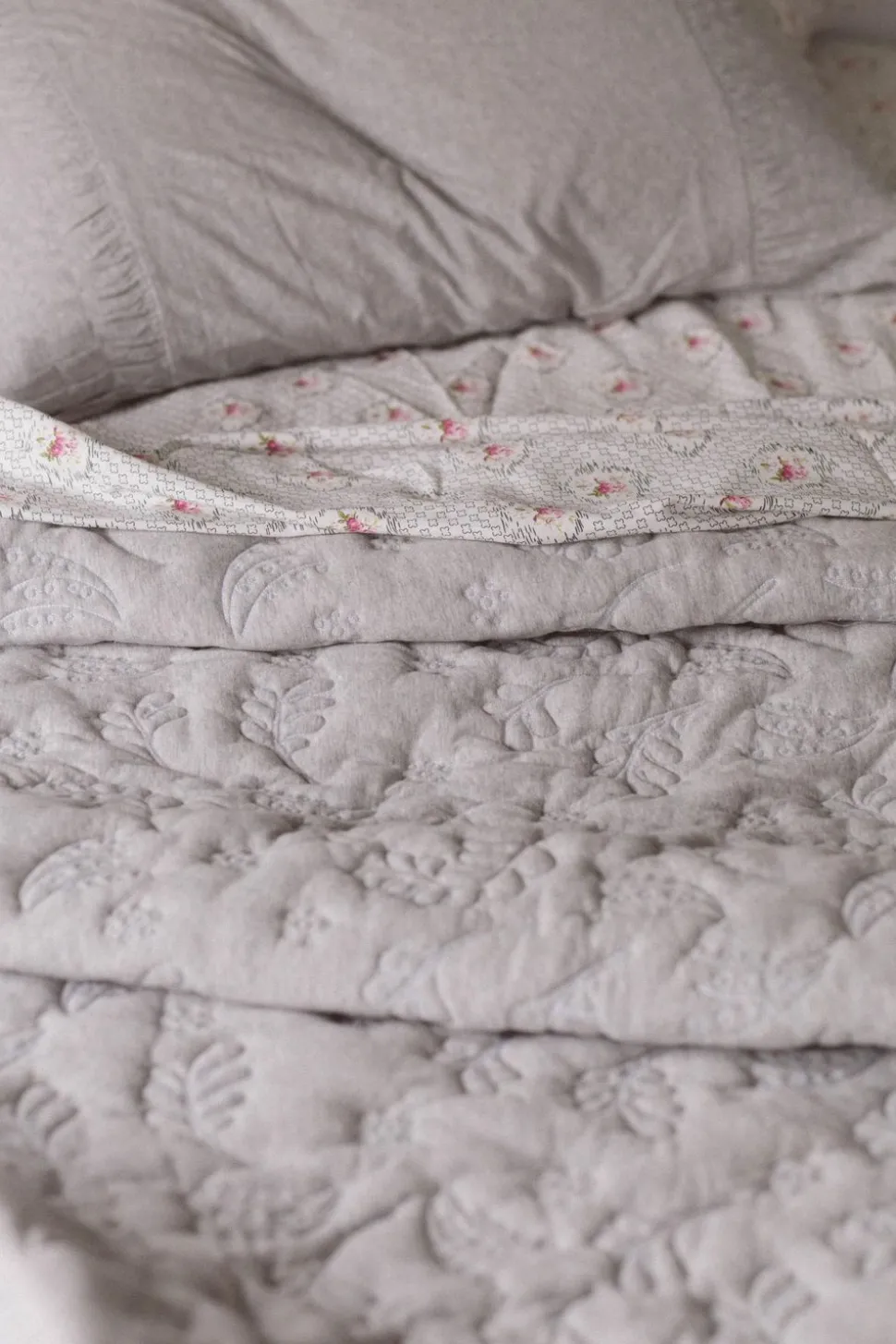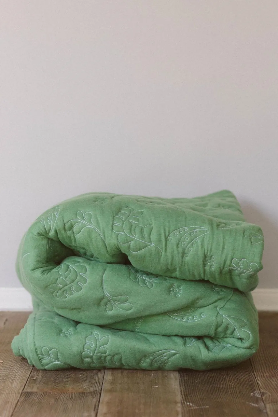 This Quilt Has A Lovely Mid Green Marle On One Side And A Lighter Grey Marle On The Other Side And Is Joined Together With A Bloomsbury Inspired Stitched Floral Design.