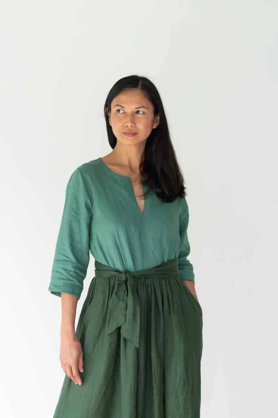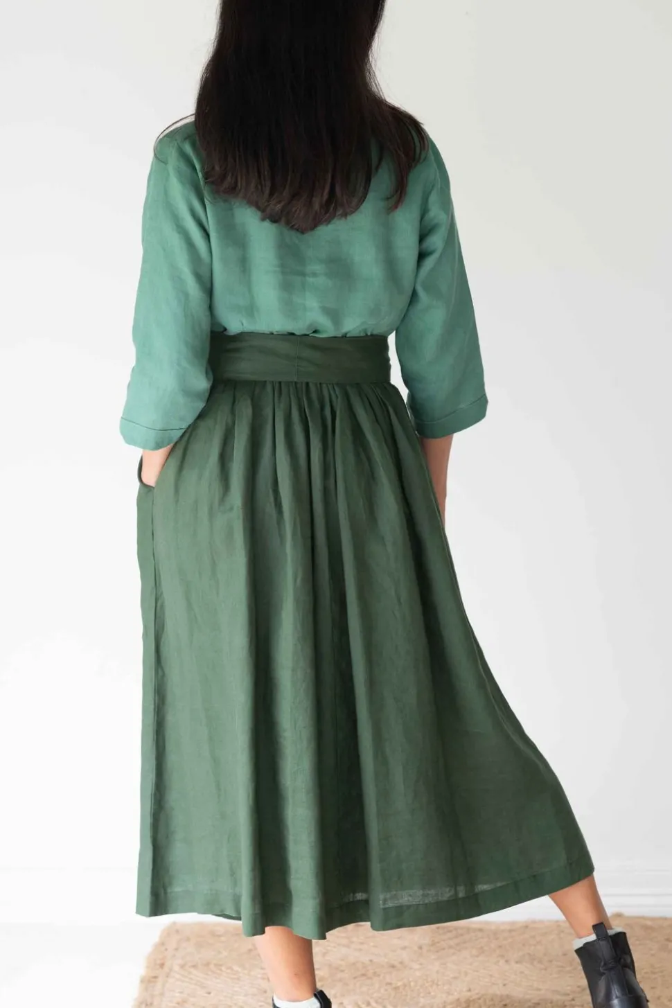 Michaela Is Our New Linen Dress With Bodice And Sleeves In Evergreen &Amp; Skirt And Belt In Forest.