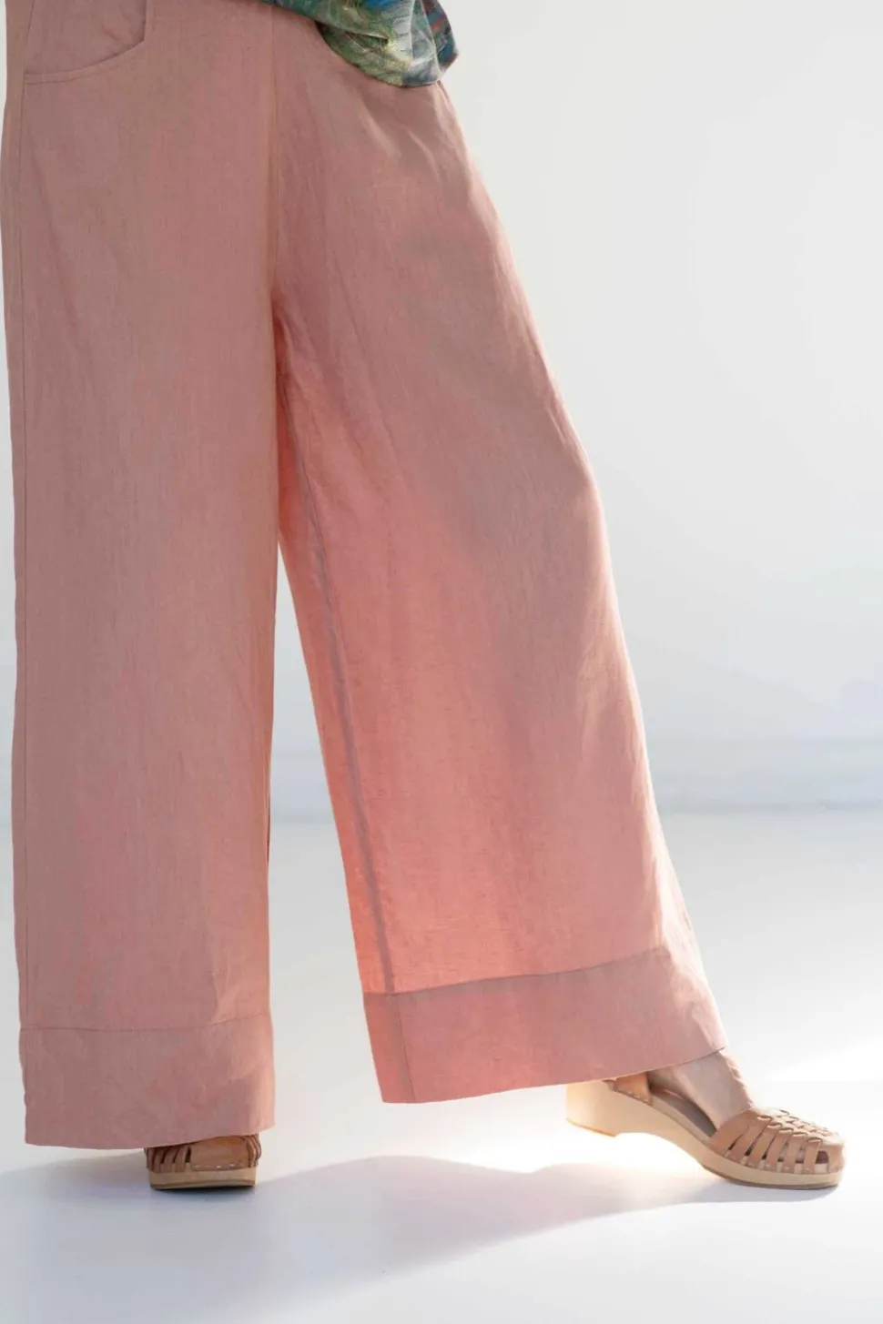 Wide Leg Pants With A Flat Front And Front Pockets.