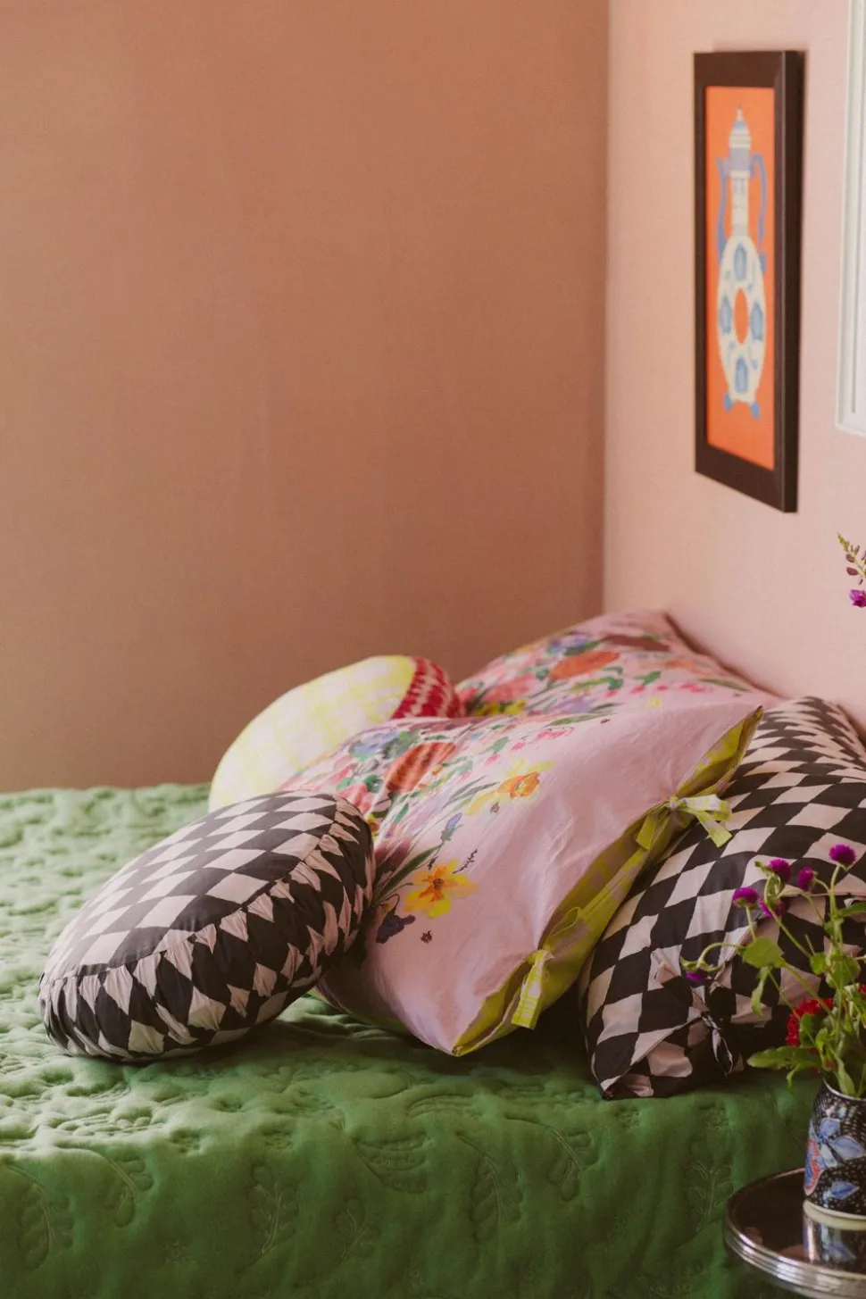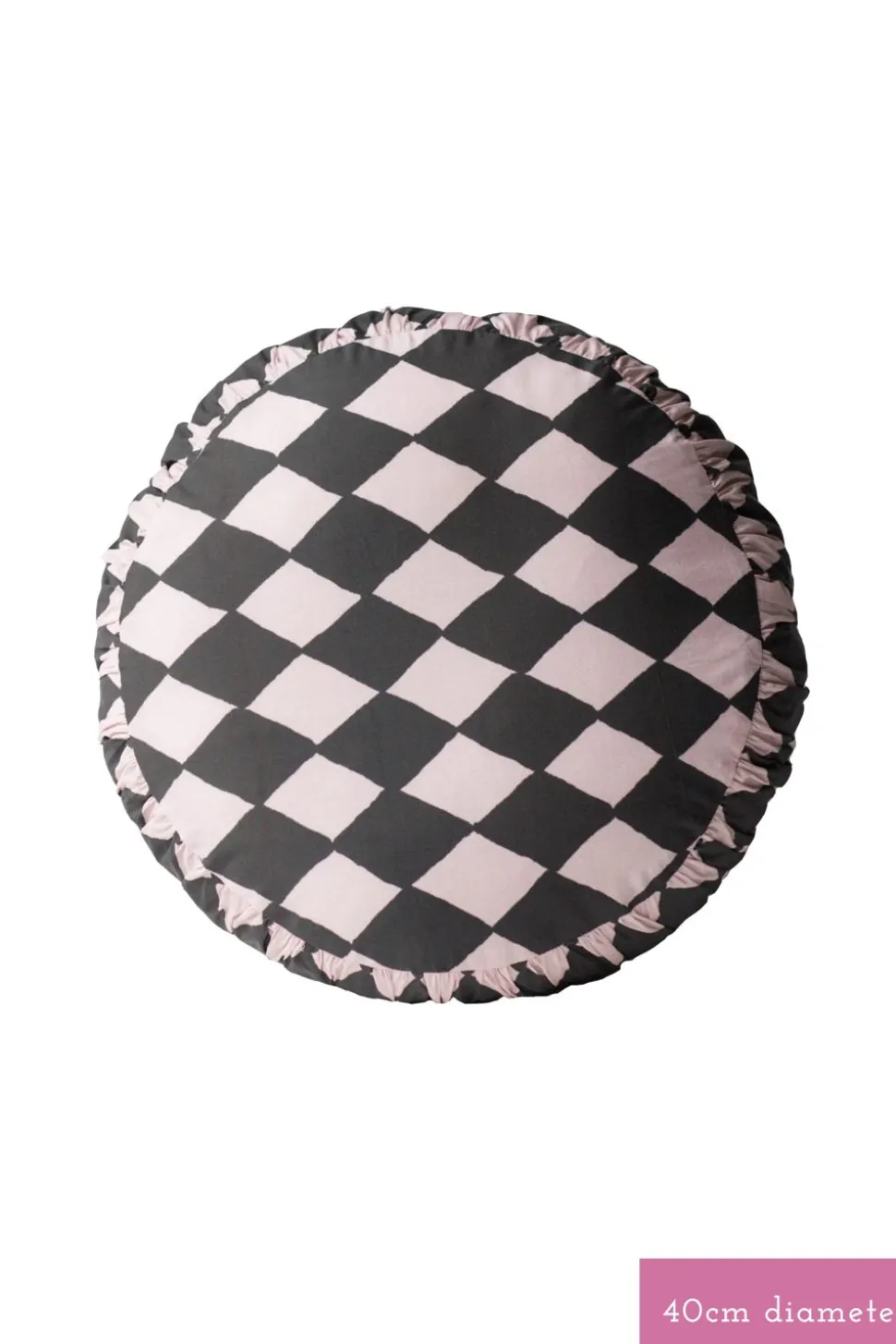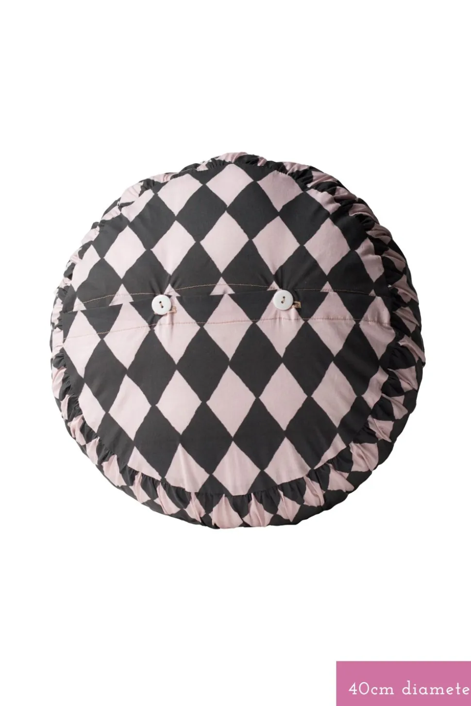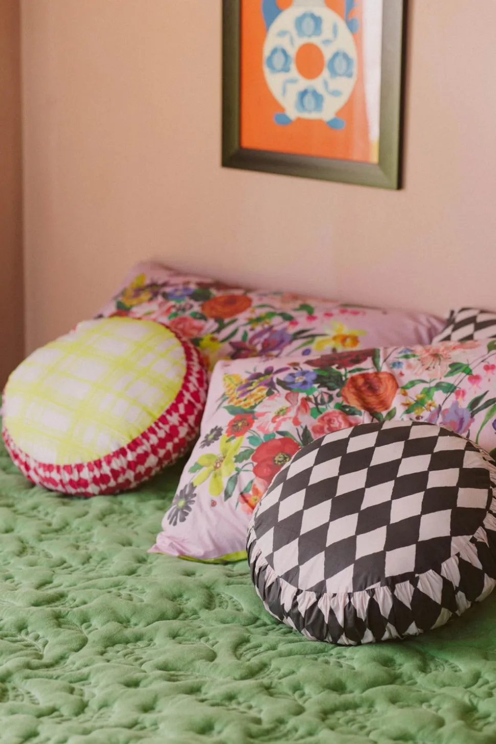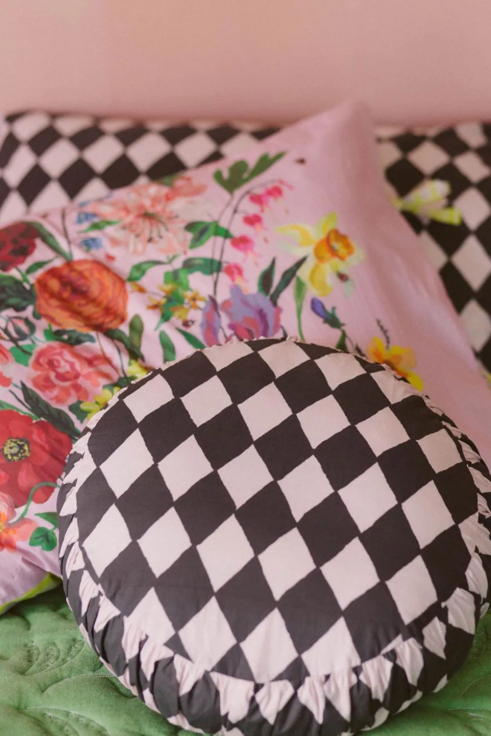 Small Round Cushion Cover Losange Shown With Rainbow Floral Pink And Charcoal Pillowcase Set, Small Round Cushion Cover In Clan Vienne And Garden Quilt.