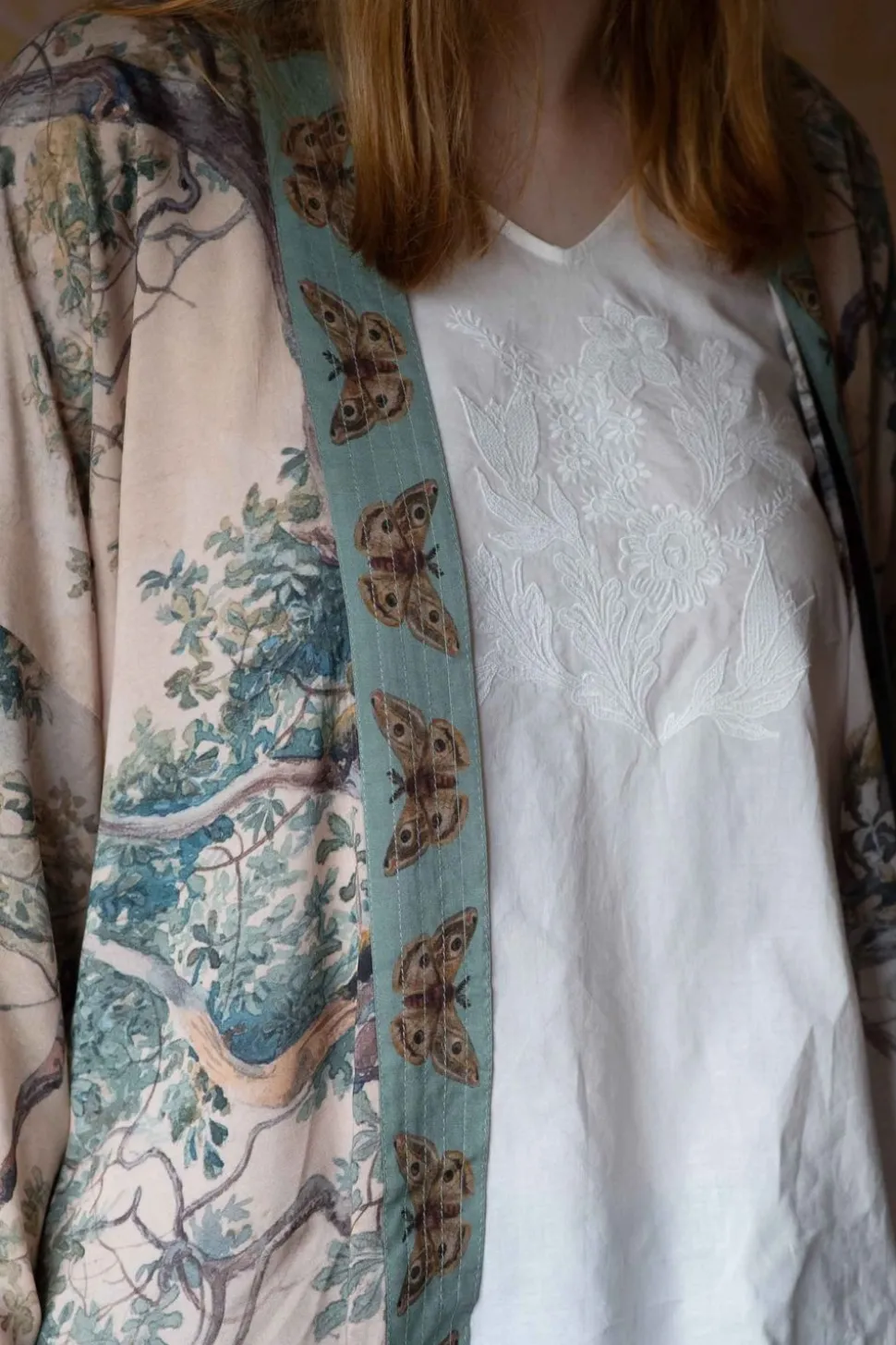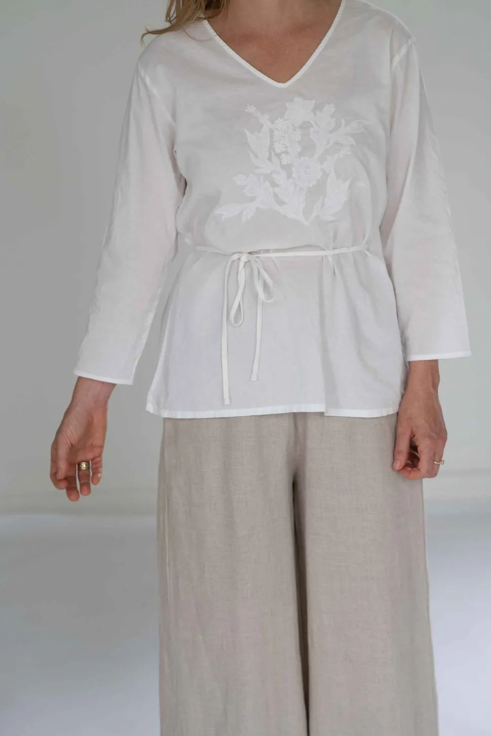 V-Neck Long Sleeved Cotton Voile Top With White Embroidery On Bodice Front.